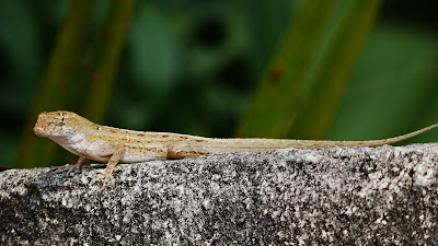 On a drive down further into the park, we stop to take a picture of an alligator (what else is new) and Glen sees this lizard on the bridge. The lizard displayed his colorful throat pouch but we never got him to do it again. He was very cute and interested in us. |